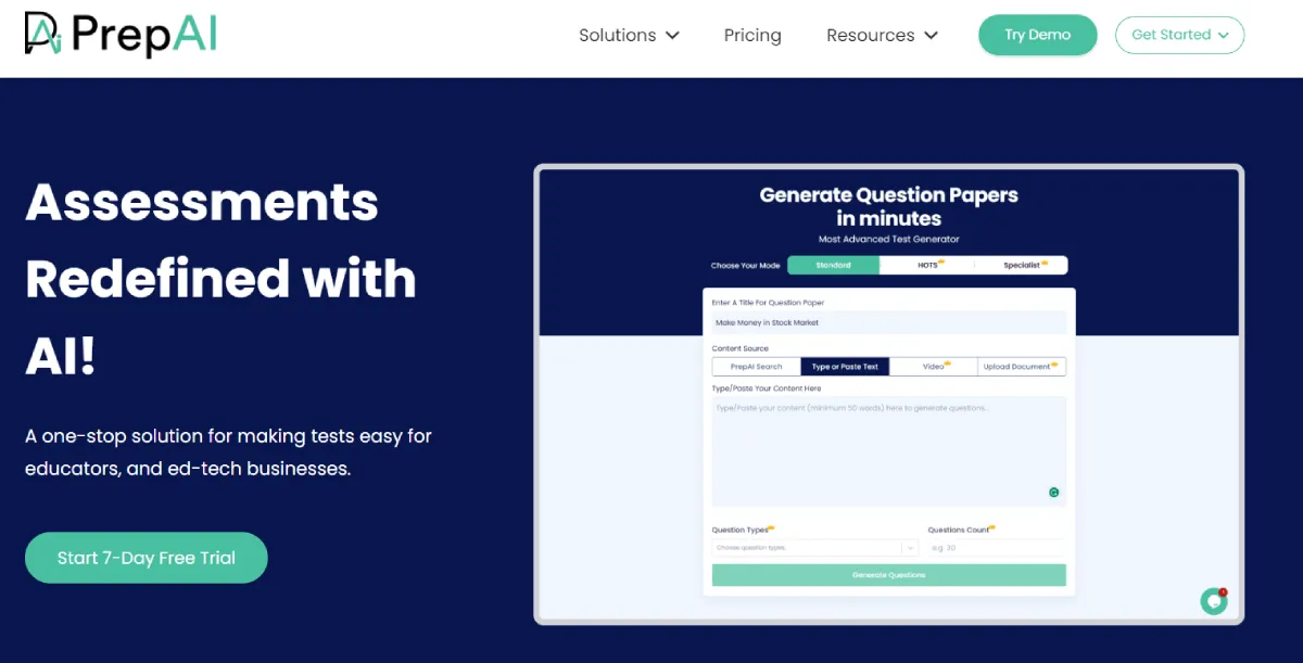 PaidPrepAI is an edtech platform that uses artificial intelligence to automate test and quiz creation. It generates various types of questions from different sources like text and videos, saving time for educators and businesses. The tool offers different question types, including critical thinking questions, and automatically grades responses. Users can customize tests, prevent cheating with randomized questions, and collaborate with peers. PrepAI provides insights into student performance through visual reports, helping educators tailor teaching strategies. By streamlining test creation and evaluation, the platform allows educators to focus on delivering quality education. Students benefit from self-paced exam preparation with randomized practice tests. Overall, PrepAI aims to enhance assessment processes for all involved parties.