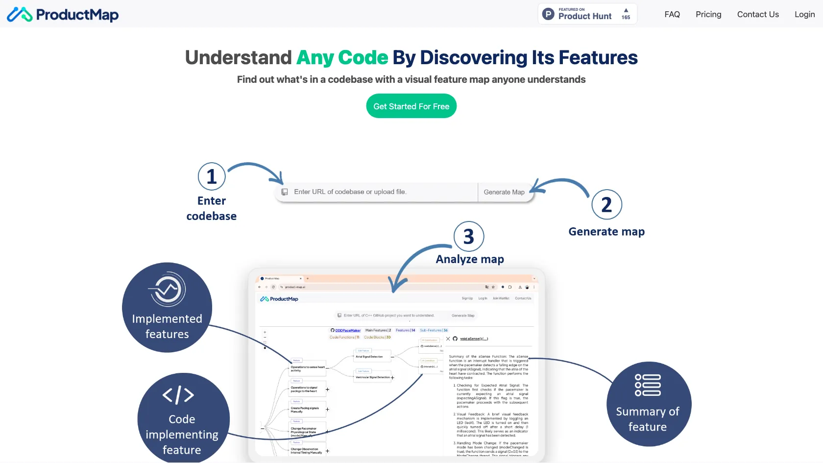 Product Map AI simplifies the process by enabling users to upload their codebase, which then generates a visual map showcasing features and functionalities. It is beneficial for teams aiming to enhance code documentation, educators instructing software concepts, and developers seeking rapid comprehension of new code.