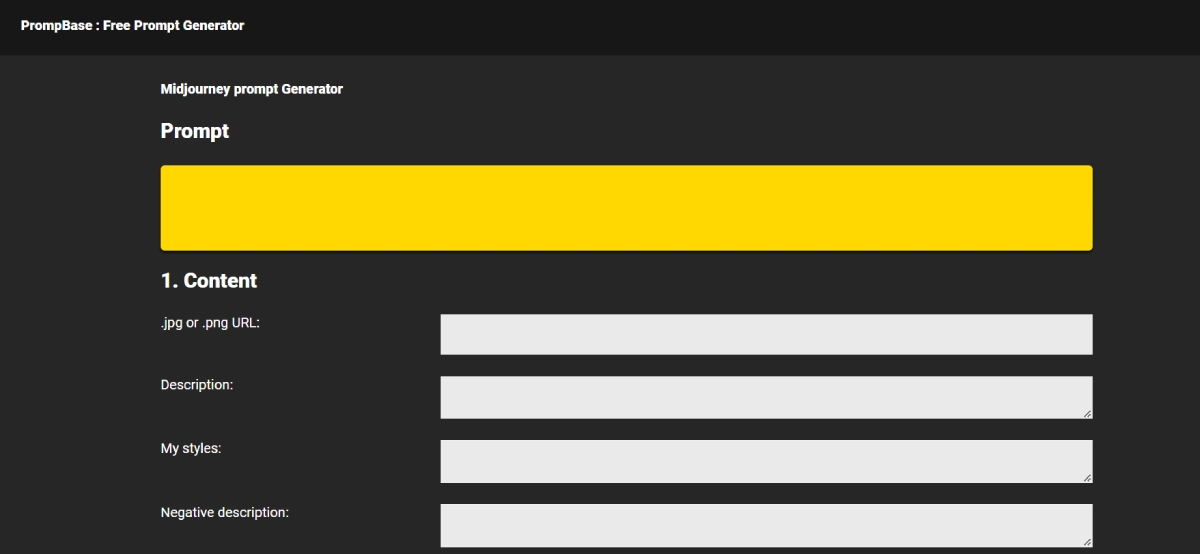 FreePrompt Base is a specialized tool that boosts creativity for artists, designers, and content creators. It features a Midjourney prompt generator that makes it easy to create personalized prompts for image generation. With a strong emphasis on flexibility and personalization, Prompt Base lets users define various parameters such as styles, shot types, and settings to ensure the generated content matches their vision perfectly. This tool streamlines the creative process by providing tailored prompts for generating images, helping users bring their ideas to life effectively.