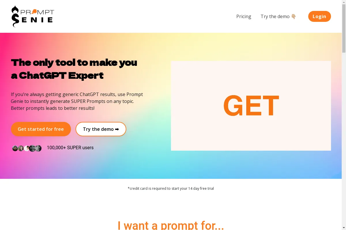 PaidPrompt Genie enhances your ChatGPT experience by generating tailored prompts swiftly. This tool eliminates generic ChatGPT outcomes, ensuring more precise and insightful responses. Trusted by over 100,000 users, Prompt Genie has received acclaim for its effectiveness. With this tool, you can bid farewell to cookie-cutter results and welcome a more personalized and accurate interaction with ChatGPT.