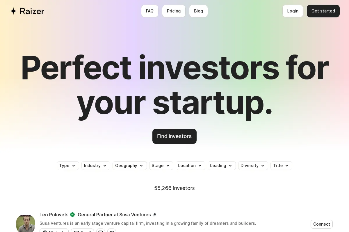 PaidRaizer is an AI platform that helps startup founders connect with relevant investors efficiently. It streamlines the investor outreach process by providing data and tools for targeted campaigns. With Raizer, founders can easily identify and reach out to potential investors, leveling the fundraising playing field. Users can sign up on the website and choose subscription plans based on database access and outreach credits required. By offering investor data and AI tools, Raizer empowers founders to run effective investor campaigns, ultimately enhancing their fundraising efforts.