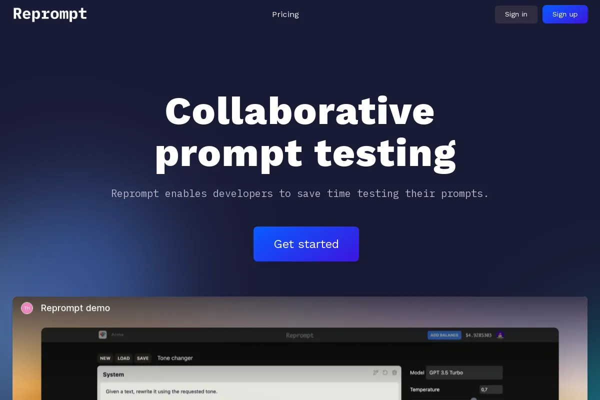 PaidRePrompt is a software platform that empowers developers to thoroughly test, analyze, and optimize prompts for generative AI. With RePrompt, users can collaborate easily and automate tasks to enhance prompt testing efficiency. By utilizing RePrompt, developers can streamline the process of testing and optimizing prompts, ensuring thoroughness while saving time. The platform's collaborative features and automation capabilities enable teams to work together effectively towards achieving prompt optimization goals. Ultimately, RePrompt is designed to facilitate comprehensive prompt testing and optimization through practical collaboration tools and automation functionalities.