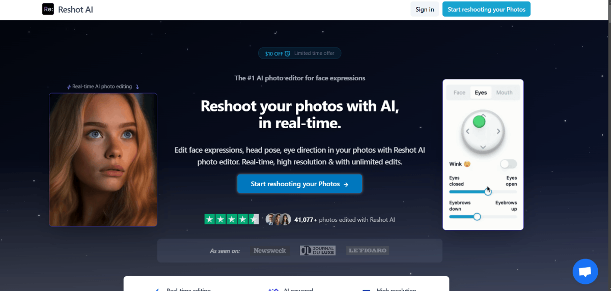 PaidReshot AI is a photo editing tool that focuses on refining facial expressions, head poses, and eye direction in images. It offers real-time editing with high-resolution outputs and extensive customization options. Whether you're a content creator, photographer, or casual user, Reshot AI provides intuitive and accessible portrait enhancement. With precision tools for adjusting expressions, head tilts, and eye positioning, it delivers professional-quality results for profile pictures, social media images, and digital content. Fast, real-time adjustments streamline the editing process for users looking to enhance their photos effortlessly.