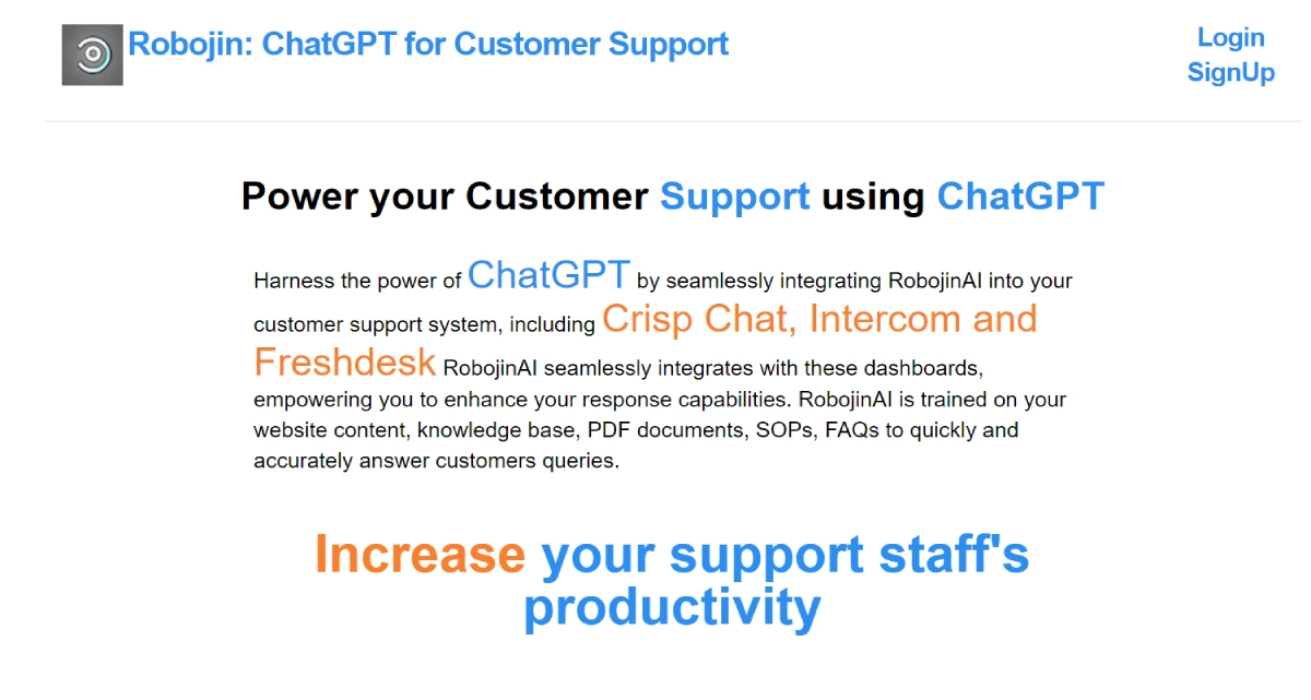PaidRoboJin AI is a customer support tool that uses ChatGPT technology to boost the productivity of customer service teams. By analyzing a company's website content, knowledge base, PDFs, SOPs, and FAQs, RoboJin AI delivers fast and accurate responses to customer inquiries on multiple platforms. Businesses can explore the platform with a trial period and opt for a hassle-free refund within 7 days if needed. The pricing structure covers 10 chatbots, integration with 200 web/PDF pages, and the capacity to handle up to 10,000 ChatGPT responses monthly without requiring an OpenAI key. RoboJin AI streamlines customer support processes, ensuring efficient and effective interactions with clients.