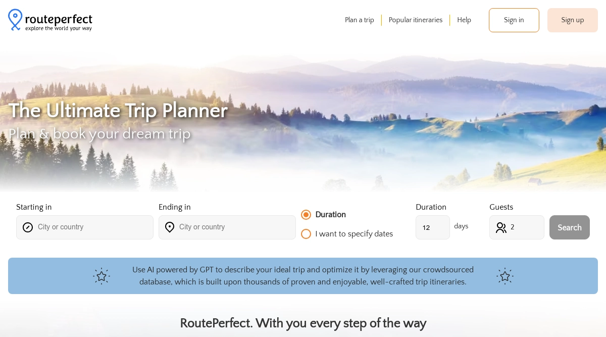 FreeRoutePerfect is an online trip planning tool that uses AI to create personalized vacation itineraries based on your preferences. It simplifies travel planning by offering tailored trip suggestions and detailed guides for popular destinations worldwide. With RoutePerfect, you can access comprehensive information to explore any location and easily book your trip. By leveraging advanced AI technology, RoutePerfect streamlines the entire travel organization process, eliminating the need for extensive research and manual planning.