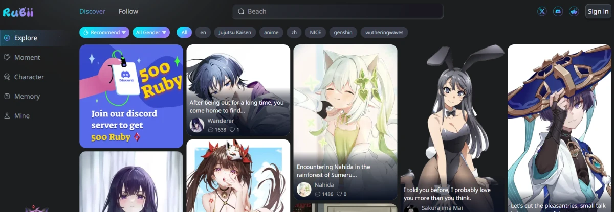 PaidRubii AI is a user-generated content platform that allows fans to engage directly with popular characters from anime and gaming franchises. Through AI-generated interactions, users can create unique experiences that resonate with beloved fandoms like Jujutsu Kaisen and Genshin Impact. This tool enables fans to explore, interact, and even role-play with their favorite characters, offering personalized dialogues and character-driven moments that feel authentic and immersive. Ideal for anime and gaming enthusiasts seeking a deeper connection with fictional worlds, Rubii AI provides a space for creative exploration and storytelling, whether for personal engagement or community sharing.
