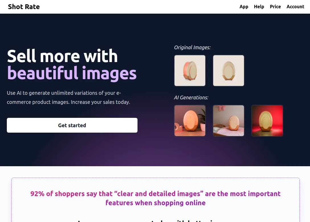 PaidShot Rate allows you to generate unlimited variations of custom product images using AI technology. By uploading a few base product images, the platform's algorithms create unique and on-brand derivatives, saving time and costs associated with traditional photo shoots. This tool helps online retailers maintain fresh imagery to engage customers and boost sales. With subscription plans, Shot Rate enables scaling of visual content for seasonal changes and new products effortlessly. In essence, Shot Rate automates the generation of high-quality product photos, enhancing ecommerce revenues through increased conversions.