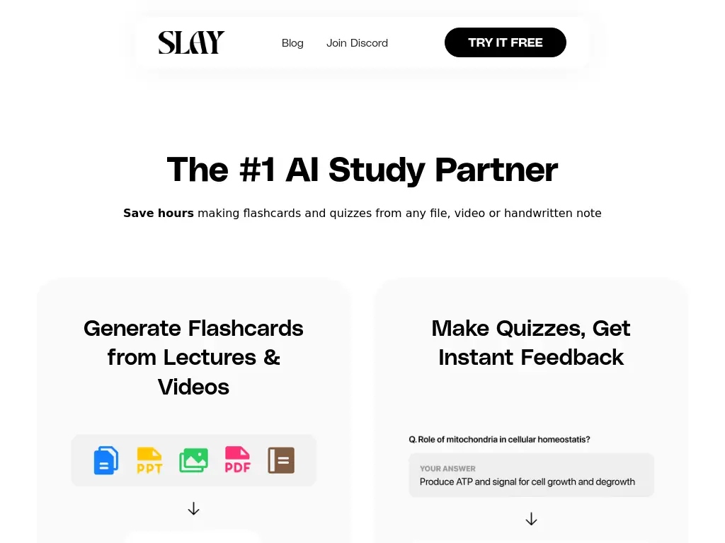 FreeSlay School AI is an AI-powered study tool that helps students save time and enhance their learning experience. It automates the creation of flashcards and quizzes from various study materials like lectures, videos, notes, and online content. This intelligent study companion uses AI technology to simplify memorization and comprehension of different subjects. By generating flashcards and quizzes from your study materials, Slay School AI enables you to focus on active recall and spaced repetition for more effective learning. With this tool, students can streamline their study process, boost retention, and improve their overall understanding of the material.