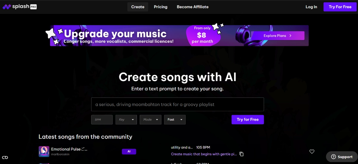 PaidSplash Pro is an AI-powered online music generator that lets you create custom songs by entering text prompts. Using advanced machine learning, it generates unique tracks based on your input, such as lyrics, mood, genre, and instruments. You can adjust parameters like BPM, key, style, and duration to tailor your song. Explore a library of community-created songs for inspiration. Ideal for musicians, composers, and podcasters, Splash Pro helps you quickly draft song ideas. Download your AI-generated songs as MP3 files for use in videos or music apps. With fast AI and cloud technology, songs are generated almost instantly. Use Splash Pro to kickstart your songwriting with melodic or harmonic ideas. Create background music for YouTube, TikTok, games, presentations, and more. Craft intros, transition stings, and scores for podcasts. The tool offers a free trial with limited exports; paid plans provide unlimited exports and additional features.