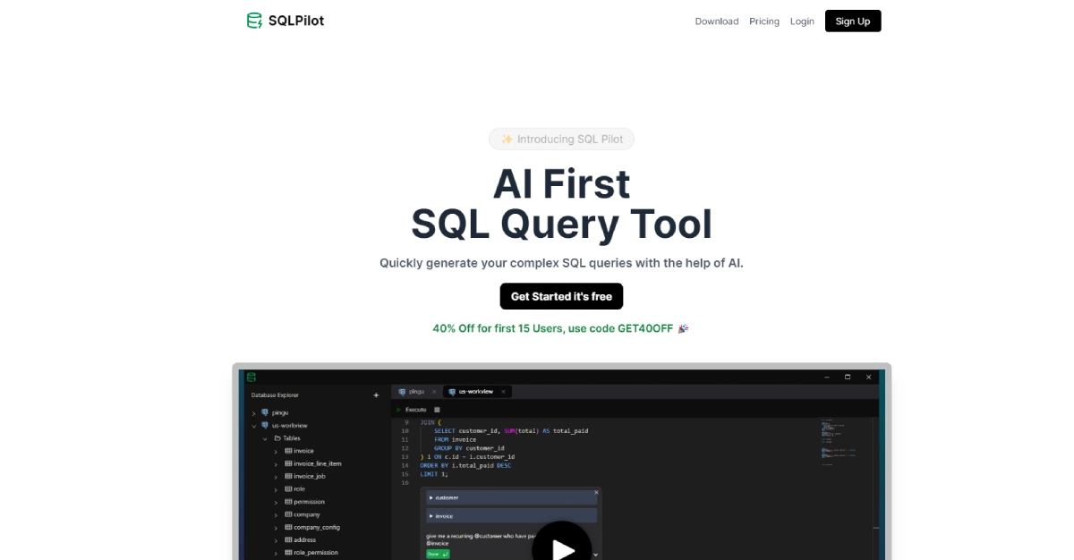 PaidSql Pilot AI is a tool that uses AI models like GPT-3.5, GPT-4, and GPT-4o to help you generate SQL queries effortlessly. It supports multiple database connections, offers autocomplete features for SQL, and prioritizes user privacy by not storing data. This tool is designed for professionals who work extensively with SQL databases and want to streamline their workflow by reducing the time spent on manual query writing.