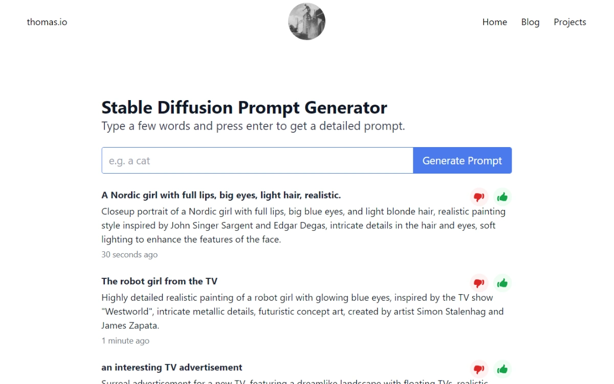 FreeThe Stable Diffusion Prompt Generator is an AI-powered tool by Thomas.io that generates detailed prompts to inspire artists and content creators. Using GPT-3 technology, it offers creative prompts for digital art, 3D rendering, and graphic design projects. This tool aims to enhance the creative process by providing diverse and elaborate prompts suitable for various artistic techniques. Artists and creators can benefit from a wide range of prompts tailored to their projects, sparking creativity and helping them overcome creative blocks.