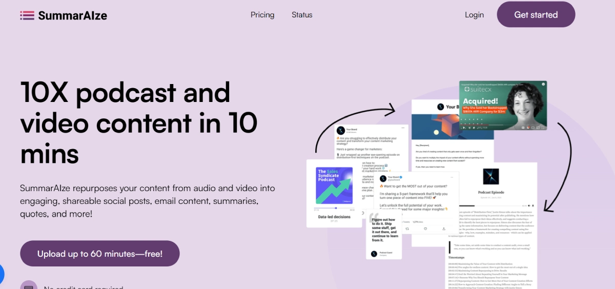 PaidSummarAIze enables transforming podcast and video content into compelling social media posts, email newsletters, and summaries. This AI-powered platform revolutionizes content repurposing by optimizing podcasts, videos, and interviews for various formats. With SummarAIze, you can efficiently create engaging social media posts, summaries, newsletters, and more from existing content.