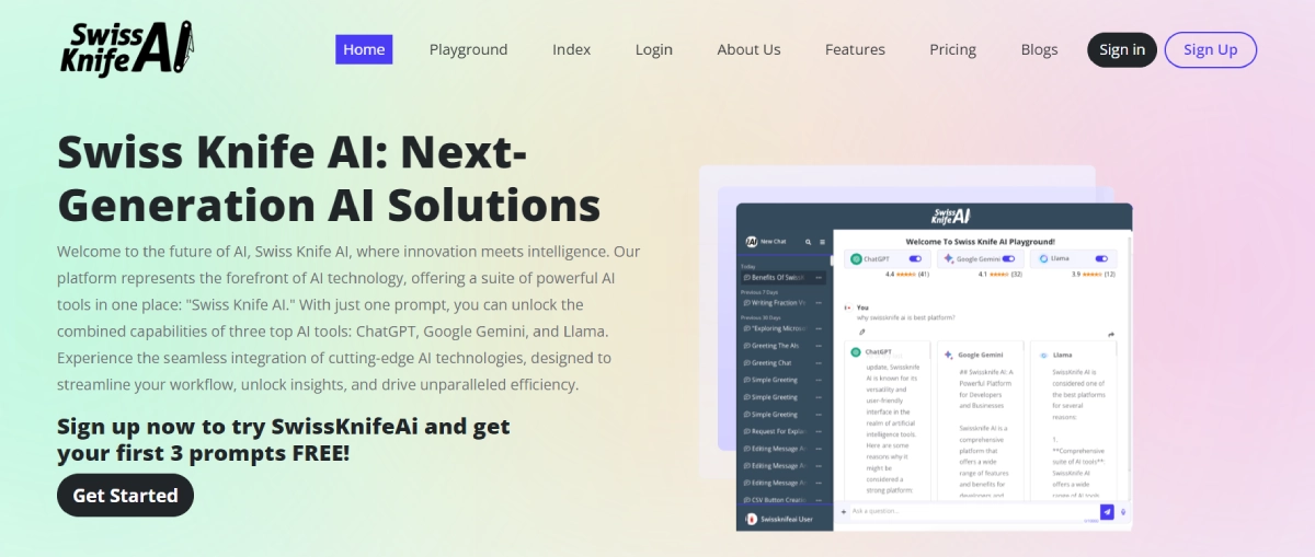 PaidSwissKnife AI is a powerful AI platform that integrates ChatGPT, Google Gemini, and Llama to provide comprehensive responses to user prompts. This tool enables users to gain diverse perspectives and insights quickly, making it valuable for businesses, researchers, and individuals seeking to streamline workflows and boost productivity. By consolidating the capabilities of multiple AI tools into a single interface, SwissKnife AI simplifies complex tasks like decision-making, content creation, and research. Users benefit from high-quality responses in a timely manner, enhancing their ability to make informed decisions and generate valuable insights efficiently.