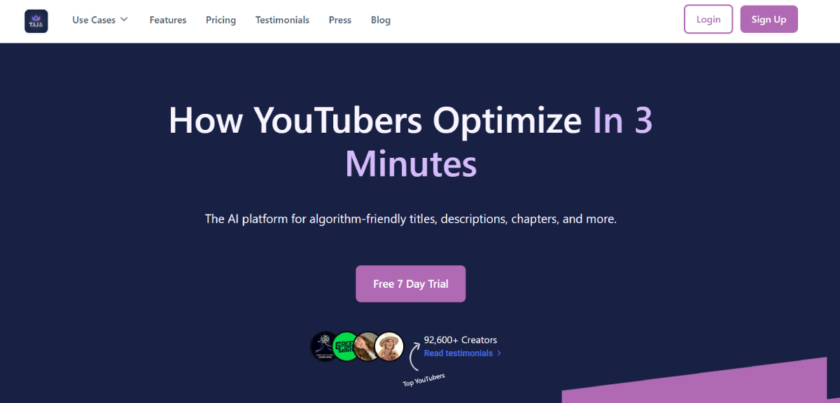 PaidTaja AI helps YouTubers enhance their video content for better performance on the platform. It provides tools like instant title creation and thumbnail generation to streamline the optimization process. You can try Taja for free for 7 days, with paid plans starting at $19.99 per month for basic features and going up to $89.99 per month for unlimited videos.
