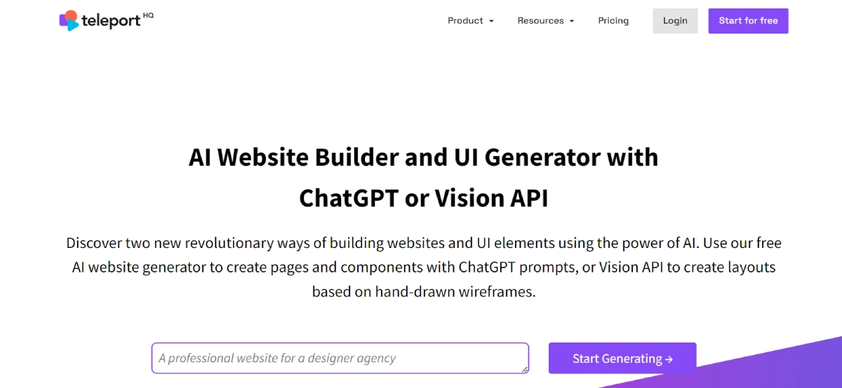 PaidTeleportHQ Website Builder is an innovative tool that uses AI technology to simplify website creation. By simply providing a single prompt, users can generate fully responsive websites quickly and effortlessly. Powered by ChatGPT, this AI Website Builder streamlines the web design process, saving users time and effort. With TeleportHQ, you can bring your online vision to life without the need for extensive coding or design skills. This tool solves the problem of complex website development by offering a user-friendly solution that caters to a wide range of users, from beginners to experienced professionals. Say goodbye to the hassle of traditional web design and hello to a more efficient way of building websites with TeleportHQ Website Builder.