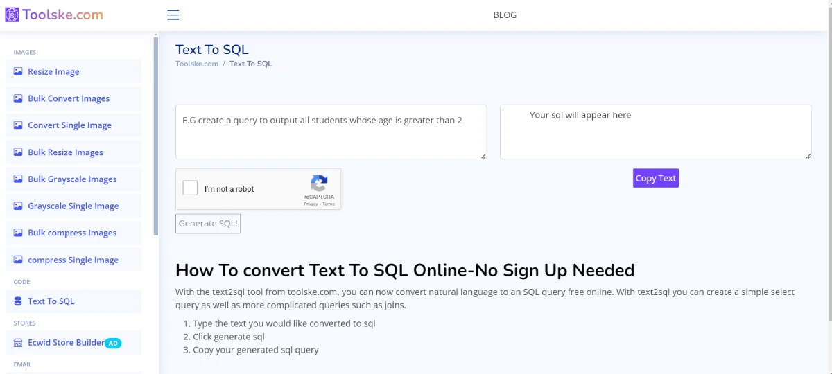 FreeText To Sql Toolske allows you to effortlessly convert natural language into SQL queries. It simplifies the process of writing SQL code, making it accessible to developers, analysts, and beginners. By inputting data needs in plain language, users can generate accurate SQL queries without extensive coding knowledge. This online tool handles complex logic and data relationships easily, supporting various query types like SELECT, INSERT, UPDATE, and DELETE. Text To Sql Toolske is convenient as it's accessible from any device with an internet connection, eliminating the need for software installation or account creation. While specific database compatibility isn't detailed, it likely supports popular systems such as MySQL, PostgreSQL, SQL Server, and Oracle.