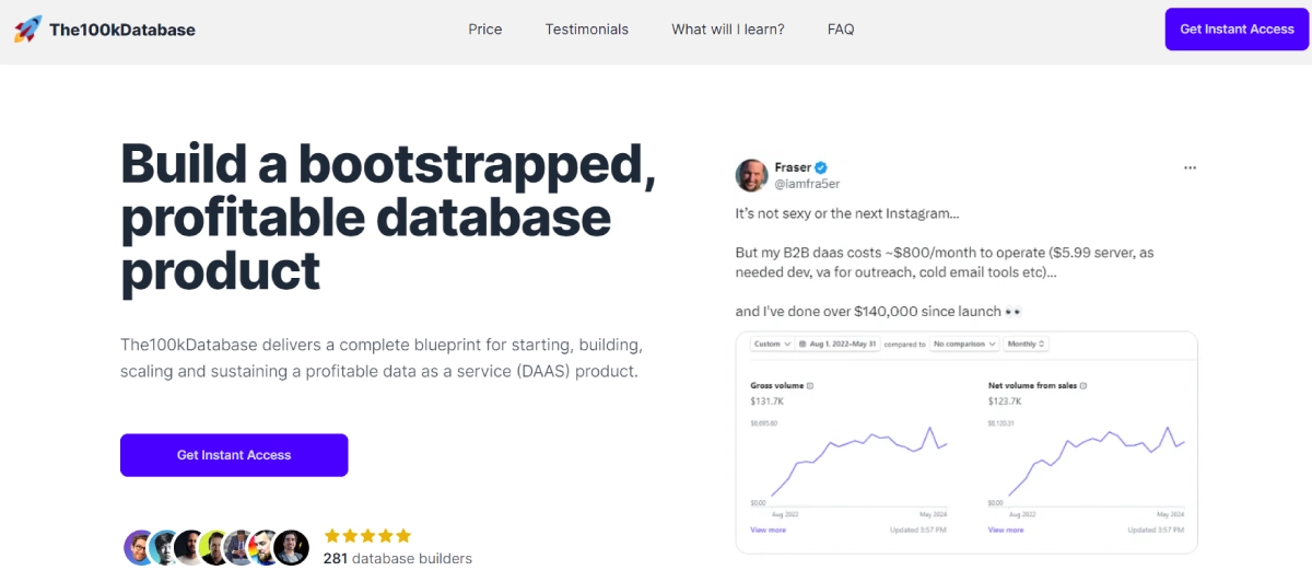 PaidThe 100k Database is a detailed guide for entrepreneurs aiming to establish and grow a profitable Data as a Service (DaaS) product. It provides a 55-page PDF outlining the entire process of developing a DaaS business, from idea conception to scaling. Users receive step-by-step instructions on attracting subscribers and efficiently expanding their venture. Additionally, access to a private Discord community allows for ongoing support and collaboration with other entrepreneurs. Noteworthy features include practical guidance, actionable steps, and The Outsource Playbook, which offers strategies for optimizing operations through task delegation.