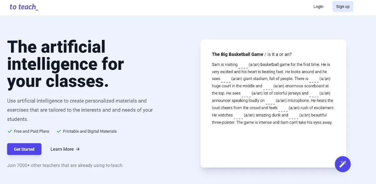 PaidTo Teach is an AI-powered edtech platform designed to streamline teaching tasks. It offers tools for creating personalized lesson plans, worksheets, and assessments tailored to students' needs. The platform adapts content based on individual learning levels and provides automatic grading and feedback. To Teach supports various interactive formats like games and videos to enhance student engagement. Educators can collaborate on content creation and easily share materials. By automating time-consuming tasks, To Teach helps educators deliver customized learning experiences efficiently, freeing up time for more valuable teaching activities.