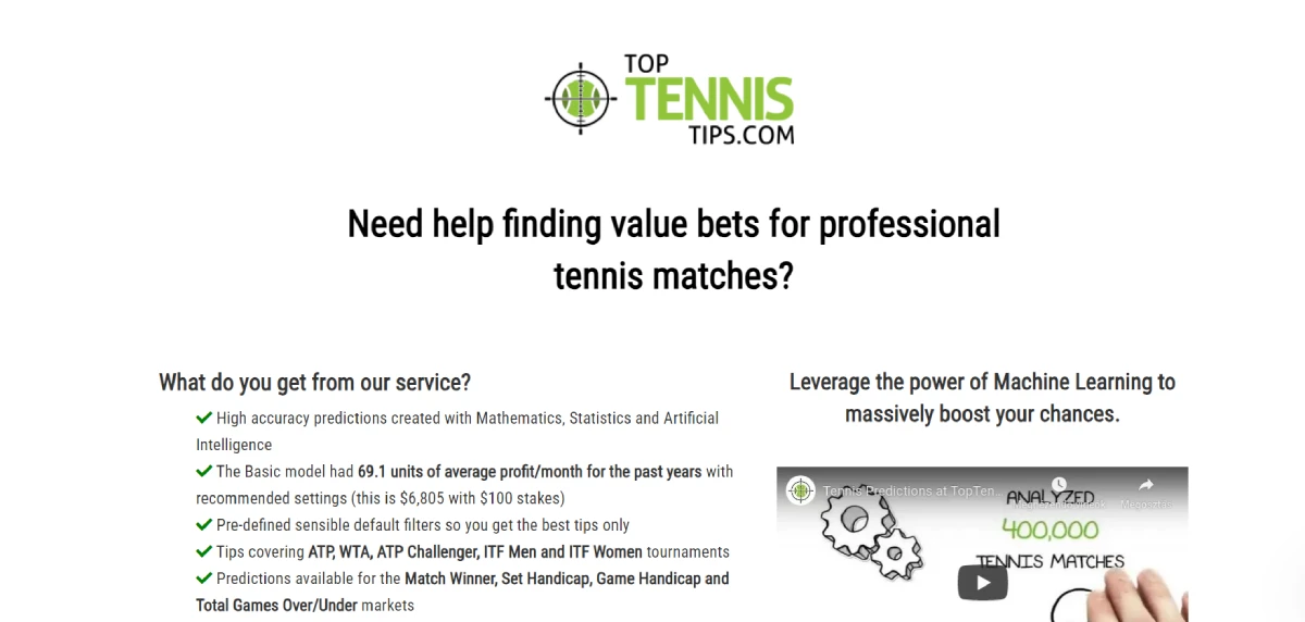 PaidTop Tennis Tips AI helps tennis enthusiasts make informed betting decisions by utilizing Mathematics, Statistics, and Artificial Intelligence for accurate predictions. This tool has a proven track record of generating an average monthly profit of 69.1 units over the past years with recommended settings, equivalent to $6,805 with $100 stakes. It covers ATP, WTA, ATP Challenger, ITF Men, and ITF Women tournaments, offering predictions for Match Winner, Set Handicap, Game Handicap, and Total Games Over/Under markets.