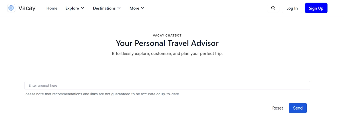 PaidVacay Chatbot is an AI travel advisor that simplifies trip planning by offering personalized recommendations through a chat interface. By using advanced AI technology, Vacay Chatbot suggests tailored vacations based on your preferences and travel style. It streamlines the research process by quickly providing ideal options. You can easily export and share your findings, keeping your travel insights organized. Vacay Chatbot continuously improves through user feedback to enhance its recommendations. With its conversational approach, trip planning becomes more interactive and engaging. By leveraging modern AI capabilities, Vacay Chatbot aims to provide human-like conversational understanding and suggestions for a smoother travel planning experience.
