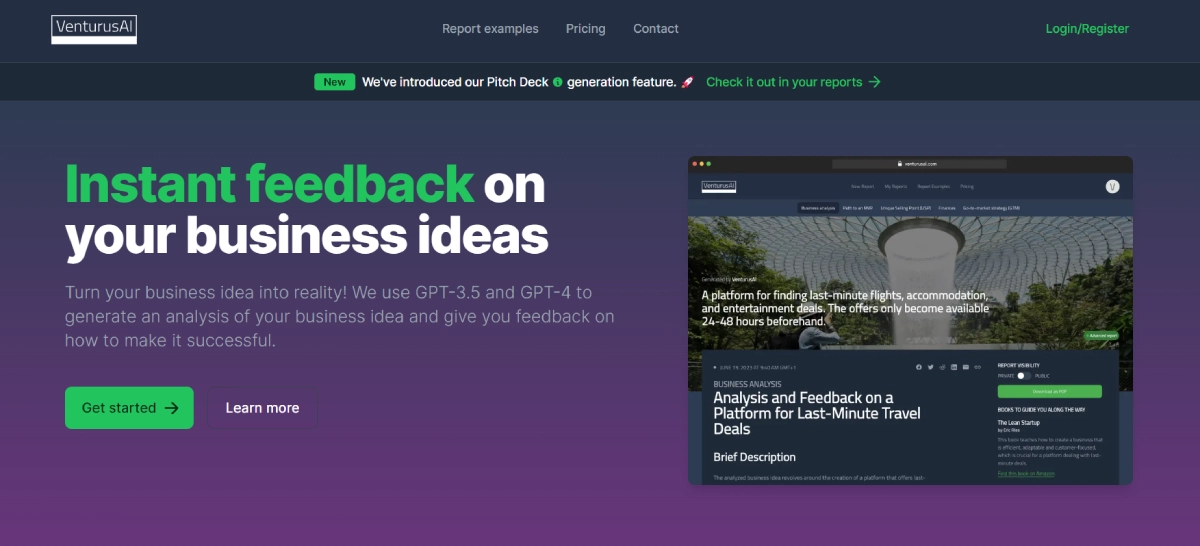PaidVenturusAI is an AI-powered web tool that gives immediate feedback on your business concepts. It uses modern natural language processing models to create custom content for your ideas. This tool provides a detailed analysis of your business plans, offering insights and suggestions to enhance their success. VenturusAI offers various pricing options, including free, basic, premium, and enterprise plans. Additionally, users can opt for an advanced report by paying a one-time fee.