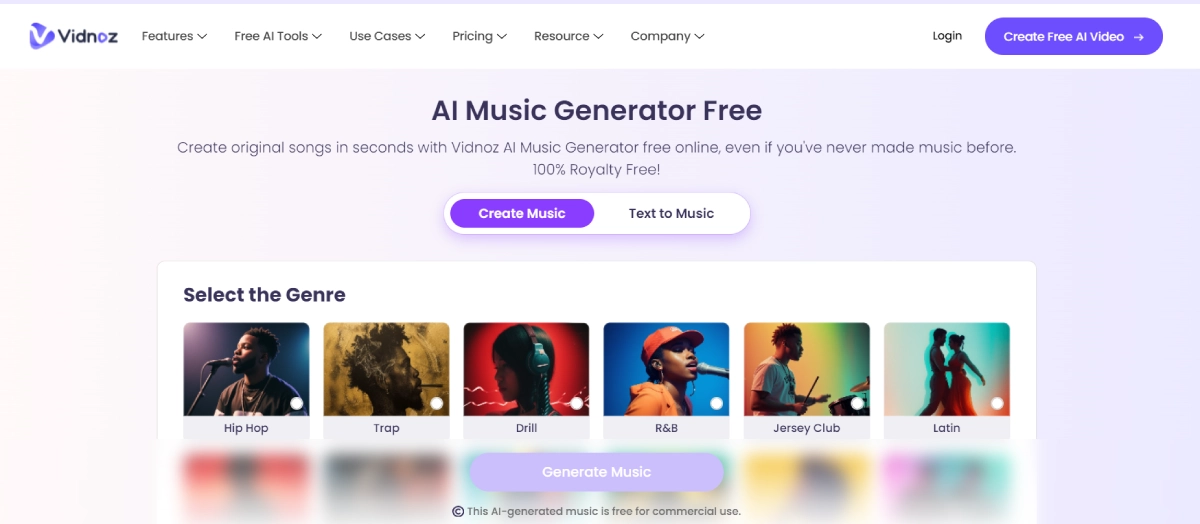 FreeVidnoz AI Music Generator allows you to create original songs quickly, regardless of your music background. By choosing from different genres, moods, and themes, you can generate royalty-free music for various uses. This tool is perfect for content creators, marketers, and anyone in need of customized music promptly.