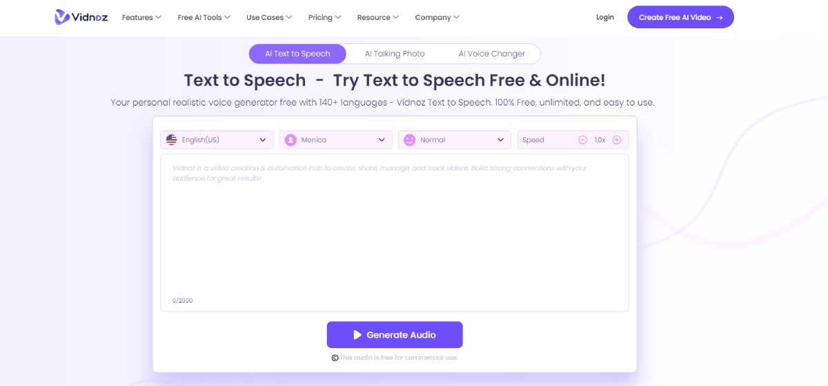 PaidVidnoz AI Text to Speech is an online tool that transforms plain text into lifelike speech. With support for 140+ languages and male/female voice options, users can create authentic audio for a range of purposes. Ideal for content creators, educators, and businesses, this tool delivers high-quality, human-like voiceovers efficiently. Whether narrating videos, enhancing presentations, or developing interactive content, Vidnoz AI Text to Speech streamlines the process with its natural-sounding output. Save time and effort by generating realistic speech from written content effortlessly.