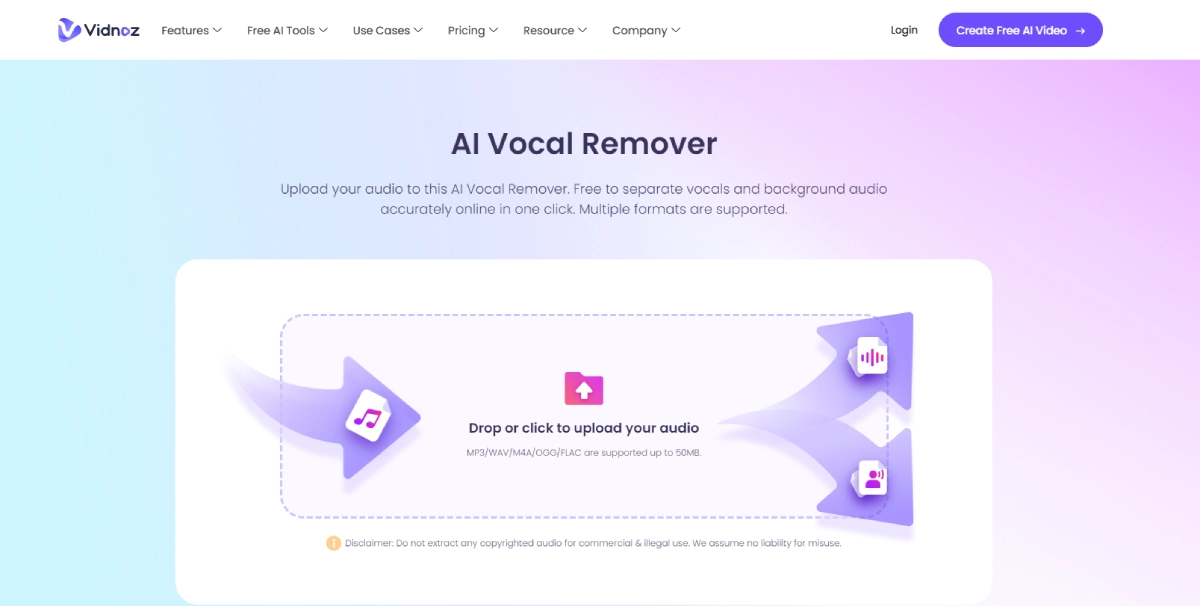 FreeVidnoz AI Vocal Remover is a free online tool that enables users to effortlessly extract vocals from background music in their audio files. With support for multiple formats, this tool offers quick and accurate separation of audio components, catering to musicians, content creators, and audio engineers. By utilizing Vidnoz AI Vocal Remover, users can easily isolate vocals for remixing, karaoke creation, or audio production purposes. This tool streamlines the process of working with audio files, providing a convenient solution for those looking to manipulate and enhance their music tracks effectively.