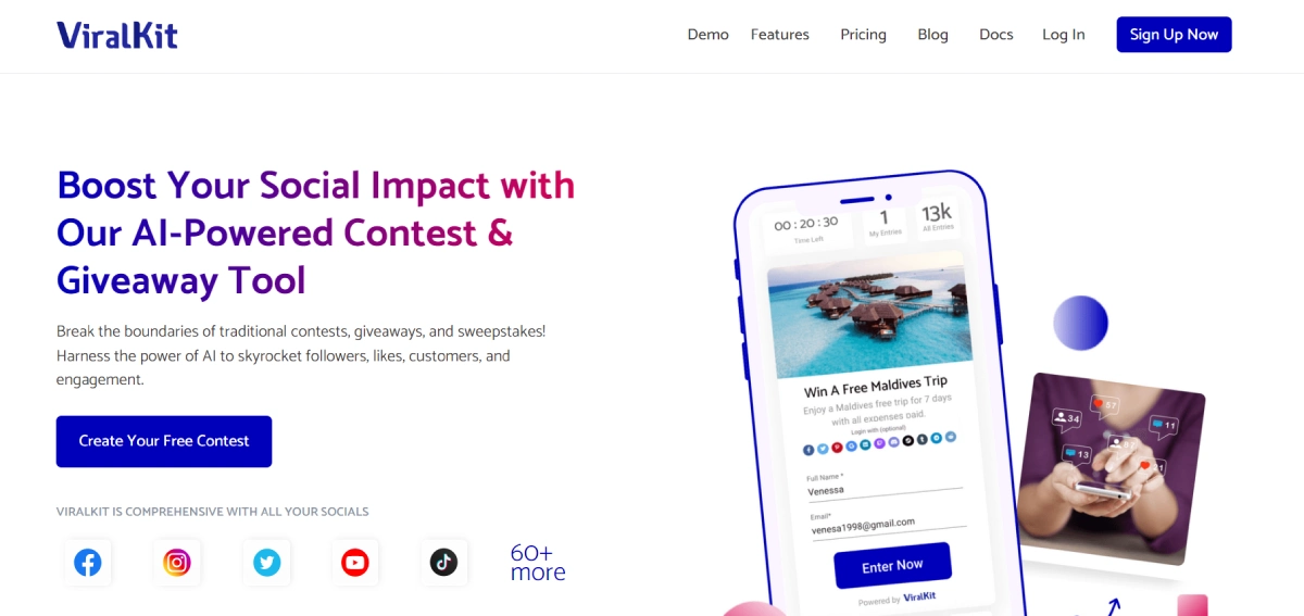 PaidViral Kit is an AI-powered platform that enables brands, influencers, and businesses to enhance their social media engagement through contests and giveaways. With Viral Kit's user-friendly contest builder, you can effortlessly create tailored contests, giveaways, and sweepstakes to expand your online presence and engage with your audience. The platform offers a free plan as well as paid Boost plans starting at $29 per month. The higher-tier plans provide additional features such as unlimited contests, priority support, and increased entries.