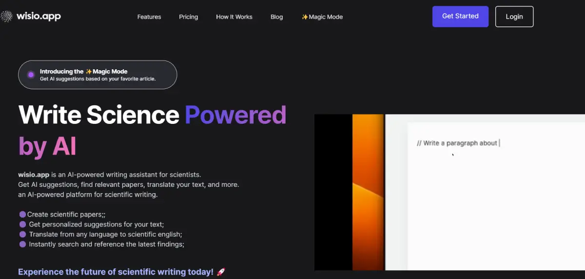 PaidWisio is a tool that simplifies and enhances scientific writing. It uses advanced natural language capabilities to help researchers, academics, and students create high-quality papers more efficiently. With an AI assistant, Wisio offers suggestions to improve clarity, precision, and flow as users write. It can also translate text between languages, integrate relevant papers into reference lists, correct grammar contextually, and format papers according to journal guidelines. Wisio saves time on manual writing tasks, allowing users to focus on core ideas and experiments. By making high-quality writing more accessible, Wisio aims to improve scientific communication efficiency and impact.