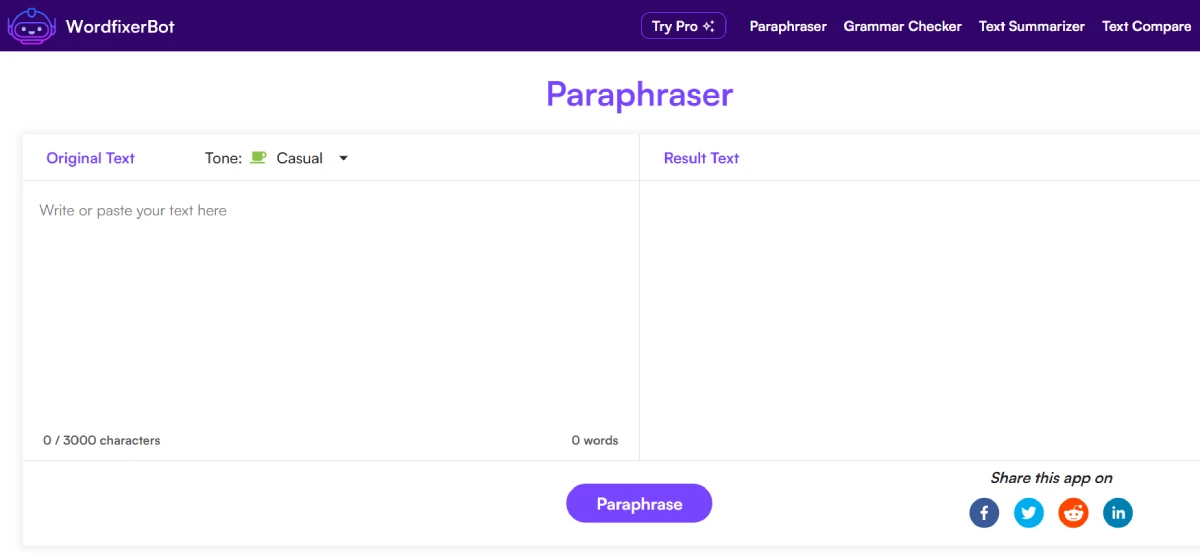 PaidWord Fixer Bot enables quick and accurate text rephrasing using advanced AI technology. This tool helps improve your writing by providing human-like paraphrasing with just one click. It offers various tone options such as casual, formal, creative, and more to match your specific needs. With Word Fixer Bot's user-friendly interface and advanced AI, enhancing your writing is easy and efficient.